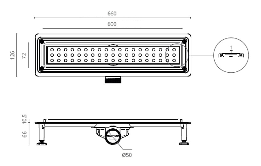 Душевой лоток с корпусом из полипропилена для применения в душевых. Доступны длины 330, 400, 500, 600, 700 и 800 мм.