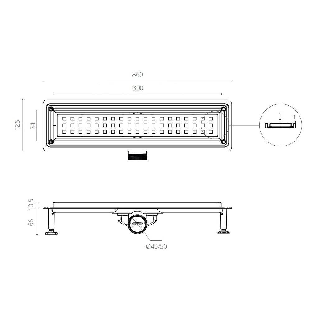 Душевой лоток с корпусом из полипропилена для применения в душевых. Доступны длины 330, 400, 500, 600, 700 и 800 мм.