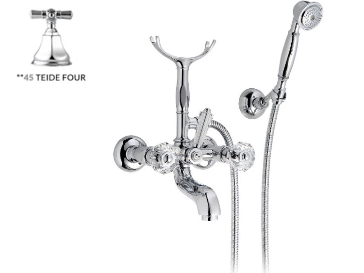 Смеситель для ванны и душа, Nicolazzi, Teide Four, тип открывания воды-двухвентильный, тип установки-настенный, вынос излива, мм-115, вид ручки-45 Teide Four, цвет-хром, с ручным душем