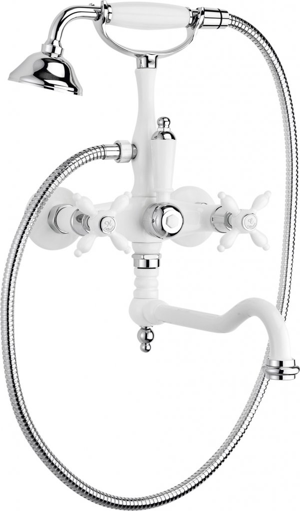 Артикул:NOSTALGIA-VDF-BLC. Наименование:Смеситель для ванны с поворотным изливом и ручным душем. Исполнение:Глянцевый Белый/Хром. Ручки:Глянцевый Белый/Хром.